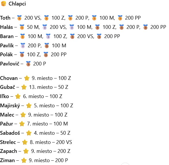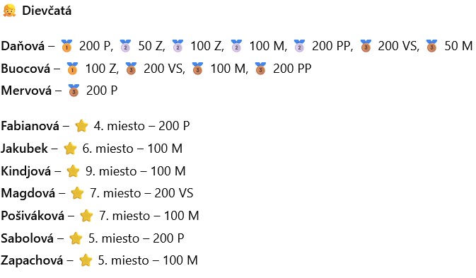 Gratulujeme všetkým k úžasným výsledkom! 🥇🥈🥉 Opäť sa prejavil silný súťaživý duch, najmä v štafetách, ktoré boli plné emócií. Ďakujeme za skvelú reprezentáciu Diamond Swimming Club Prešov. 💎