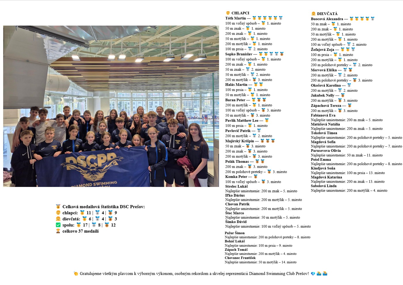 🎉 Všetkým plavcom Diamond Swimming Club Prešov srdečne gratulujeme k získaným 🥇🥈🥉 medailám aj k množstvu osobných rekordov!